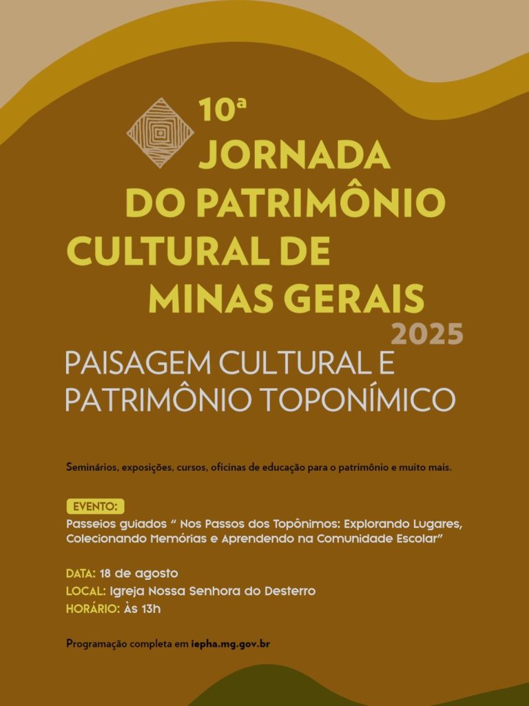 Como parte da 10ª Jornada do Patrimônio Cultural de Minas Gerais, com o tema “Paisagem Cultural e Patrimônio Toponímico”, o município receberá no dia 18 de agosto, às 13h, o evento especial “Nos Passos dos Topônimos”. A atividade consiste em passeios guiados que buscam valorizar a história e a memória dos nomes dos lugares, promovendo o reconhecimento do território a partir da vivência e da oralidade na comunidade escolar.